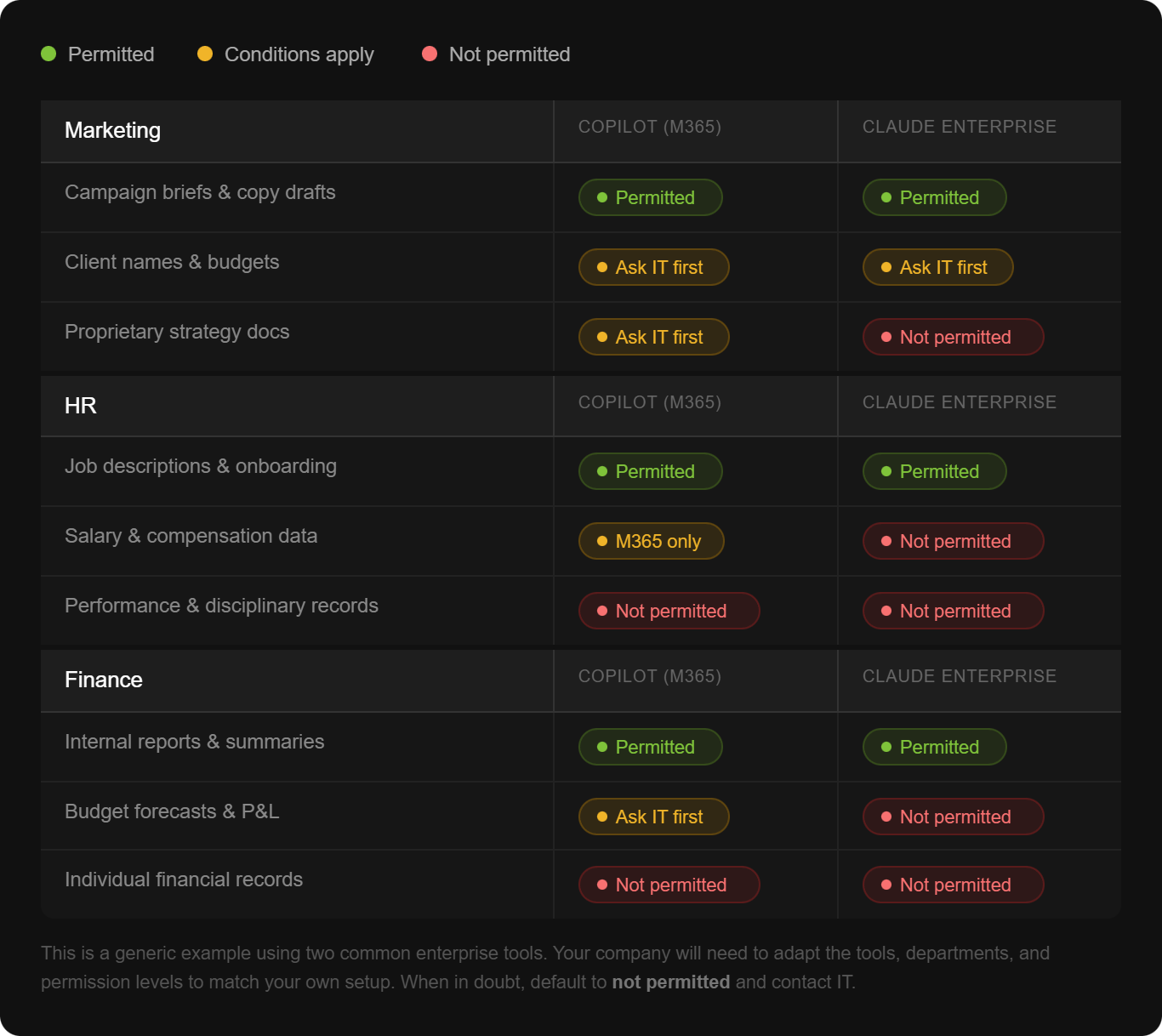 The goal is not to make the table exhaustive. It is to give employees a fast, reliable reference. Add a default rule at the bottom: when in doubt, do not share it and contact IT.